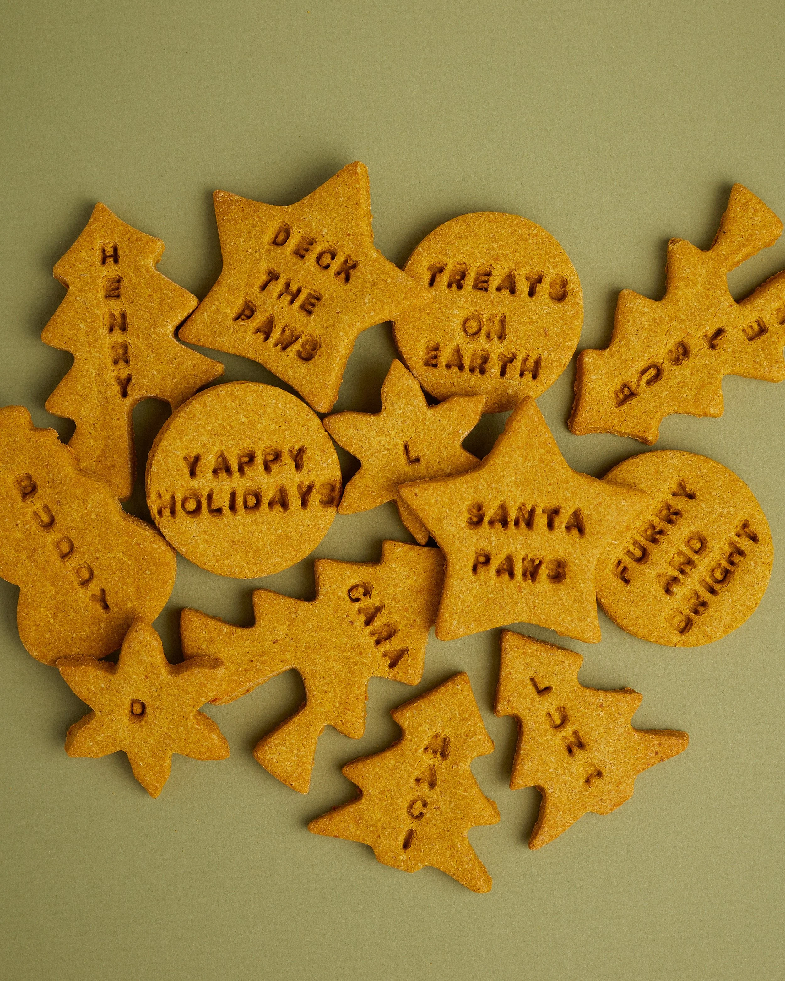 A mixture of Holiday themed treats personalized with your dog’s name on them.